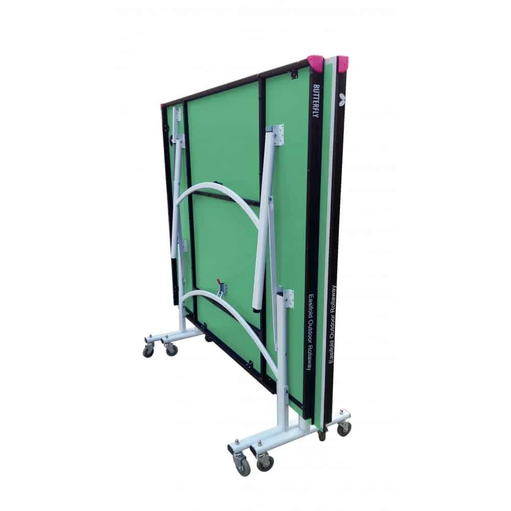 Butterfly Easifold 12 Green Outdoor Rollaway Table Tennis Table – With a Butterfly 12mm plywood resin weatherproof playing top, this table provides a good bounce and playing performance combined with an 8 wheel system with economic storage and lighter rollaway benefits. This table is ideal for hotel and home use. It divides into 2 halves which makes movement and storage simple and easy. It comes with a full length cover, outdoor net and post set, 2 bats and 3 balls.
