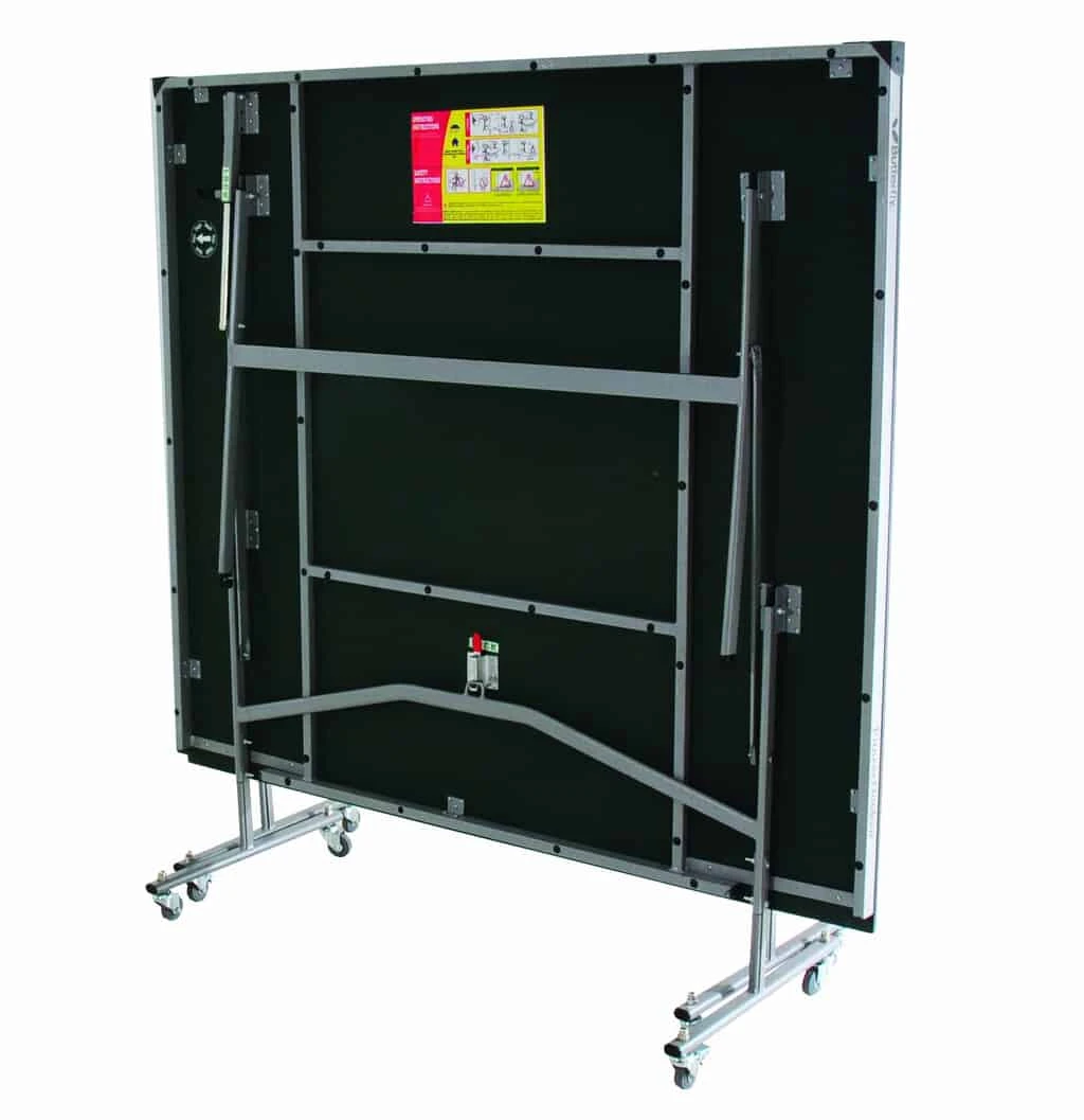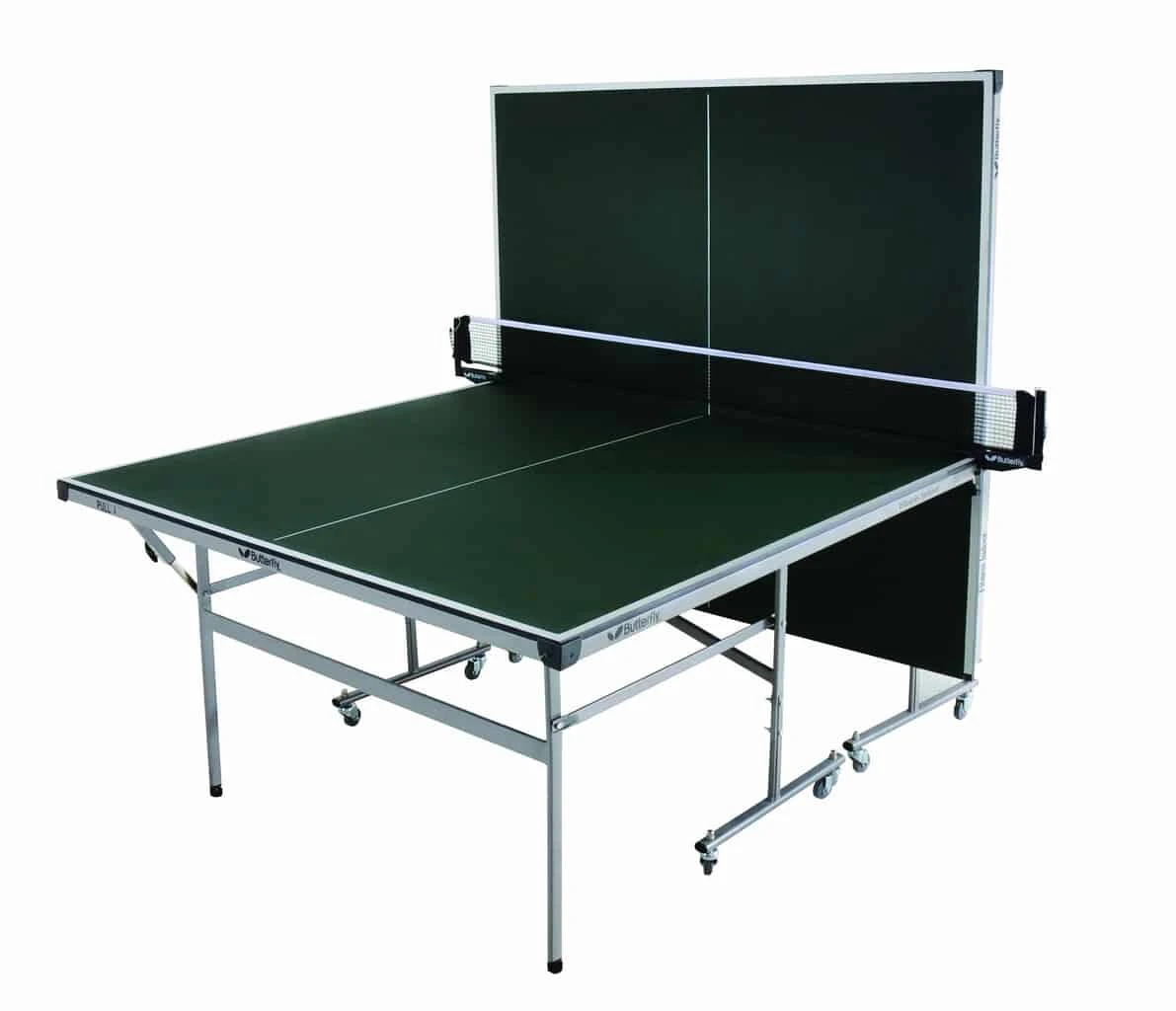 Butterfly Fitness Green Rollaway Table Tennis Table. With a 16mm playing top that produces a good consistent bounce and the 8 wheel undercarriage system providing economic storage and lighter rollaway benefits, the Fitness table is ideal for home and recreational use. It divides into two halves which makes the movement and storage simple and easy. Included in a Butterfly Clip net and post set, 2 bats and 3 balls.