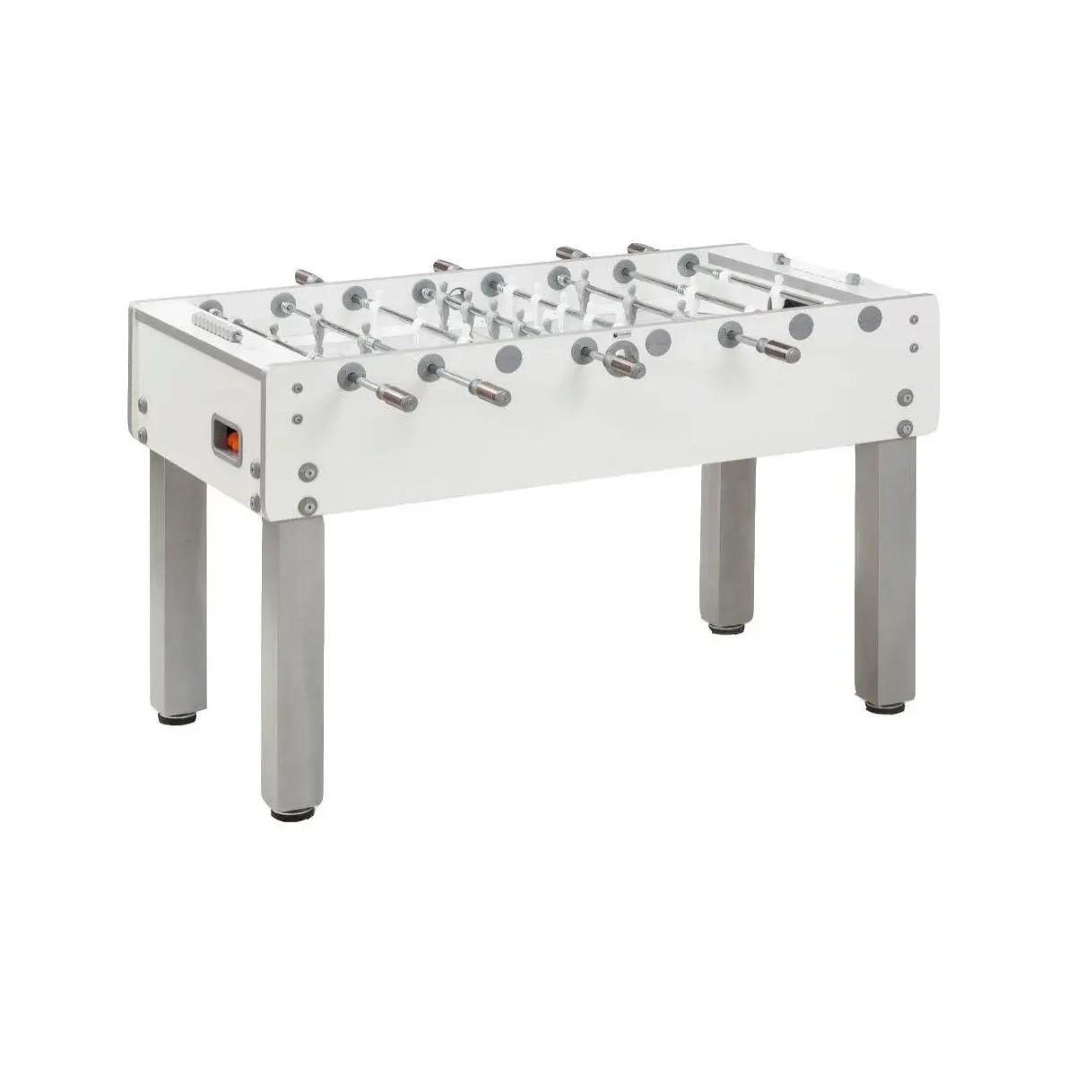 Garlando G500 Pure White Football Table – Based on the standard G500, but is an ultra-modern, high spec version of the classic favourite. It has a white cabinet with silver edges, silver powder coated legs, telescopic rods, grey and white players, sanded glass playing field, handles with wooden inserts and leg levellers.