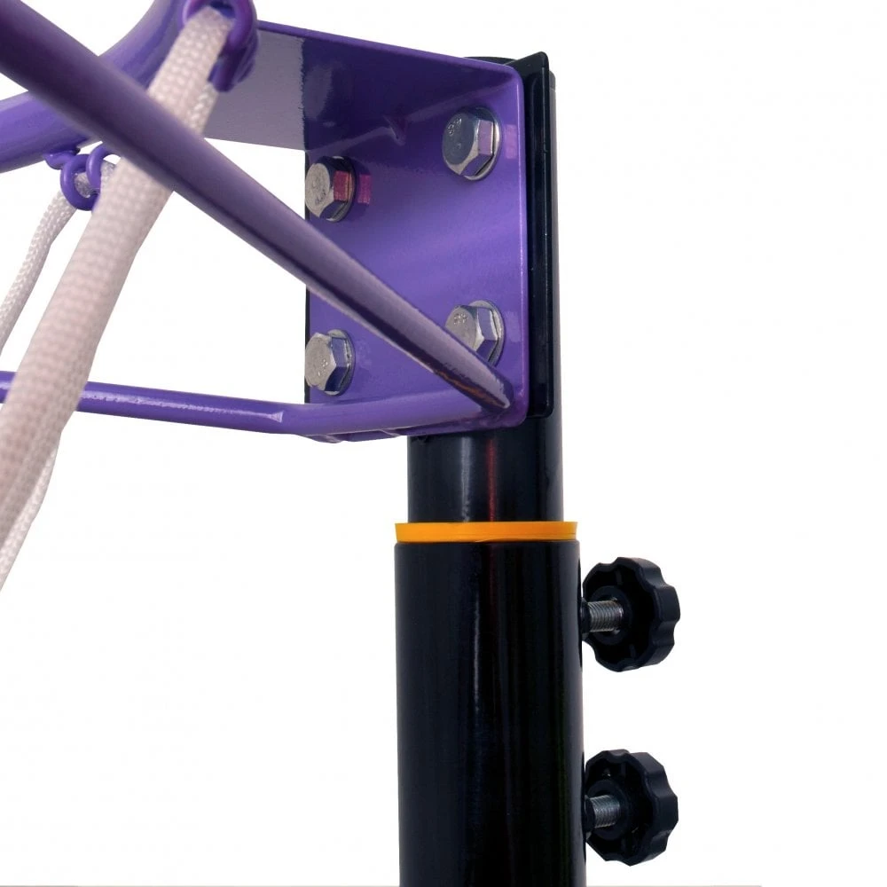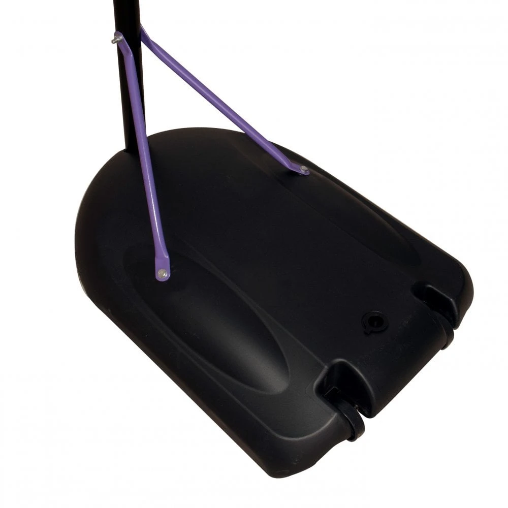 The model has a black pole and a purple 15” powder coated steel ring (38cm) including hooks for easy attachment of the white nylon net and comes complete with a matching pole padding for added player safety when in use. The Goal Shot Unit features a durable ballast box with wheels that require 50 litres of water or 75kgs of sand to ensure maximum stability.